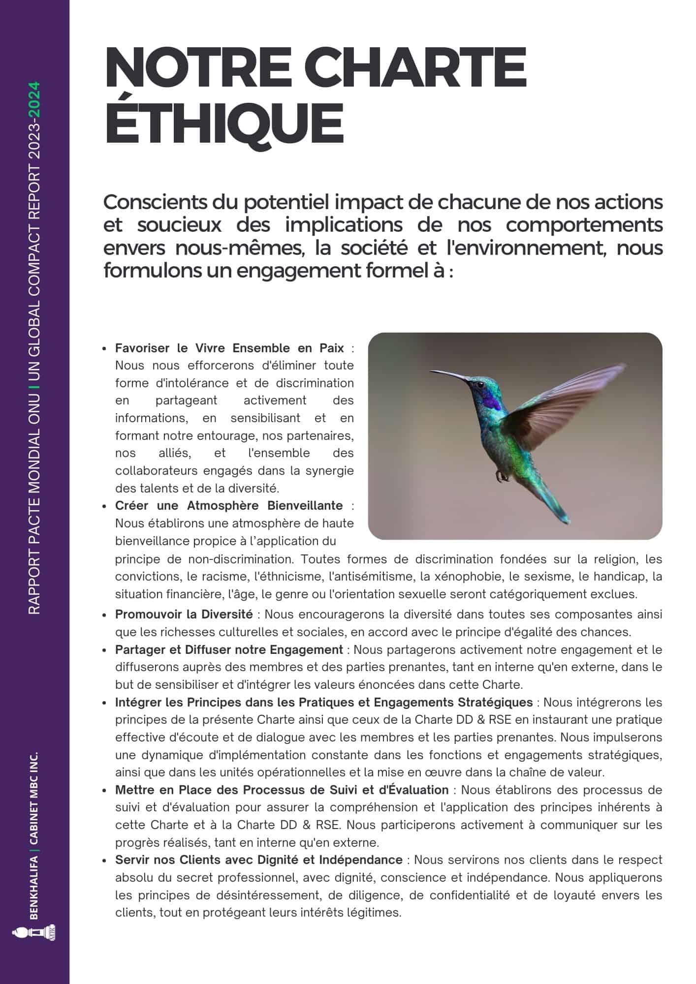 Engagement dans la démarche intégrant les 10 principes du Pacte Mondial des Nations (UN Global Compact), dans la stratégie développement durable du Cabinet.